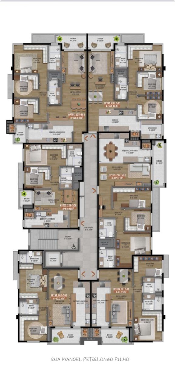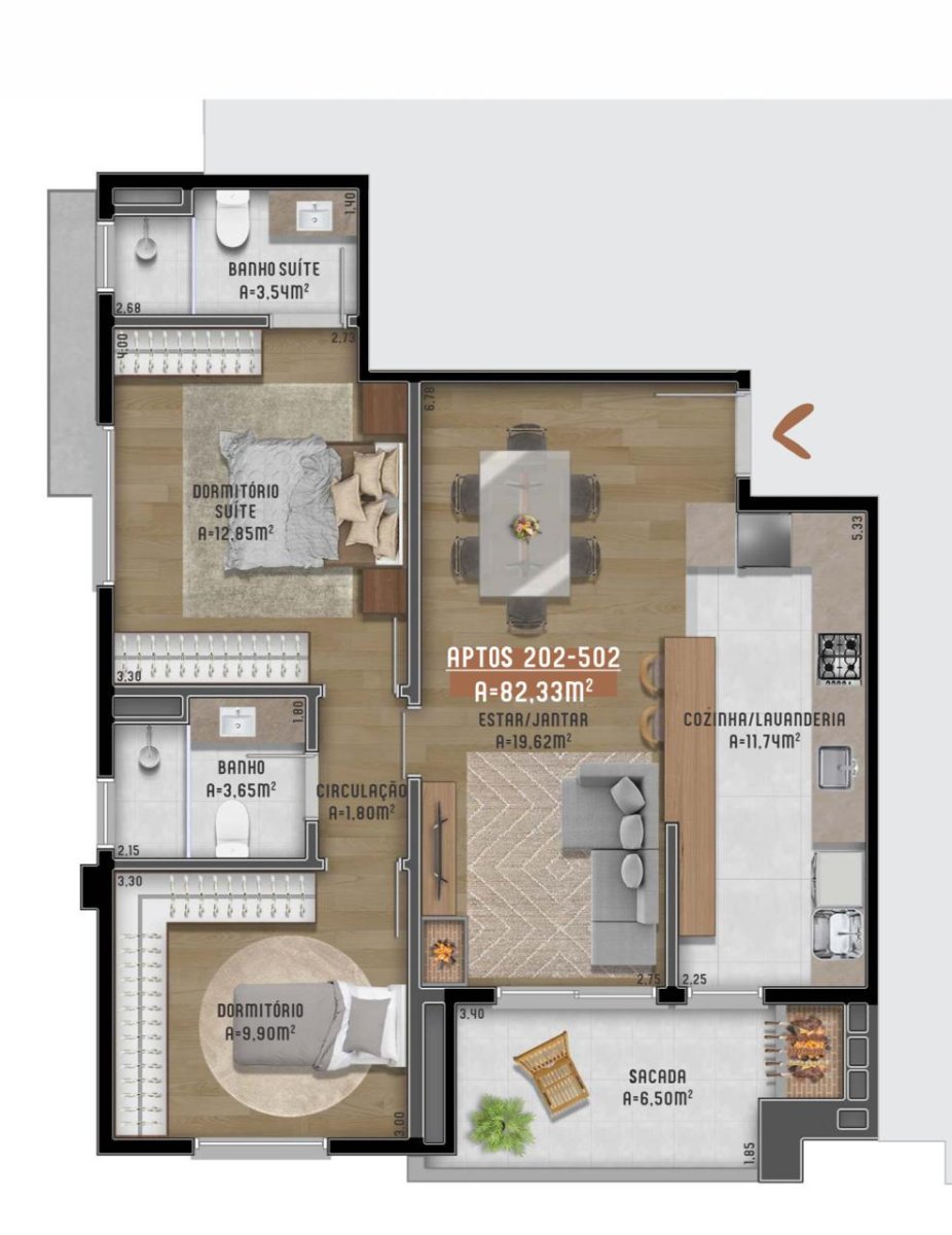 - 02 dormitórios sendo 01 suíte, cozinha, área de serviço, sala de estar/jantar, sacada com churrasqueira, circulação, banheiro social e 02 vagas de garagem;