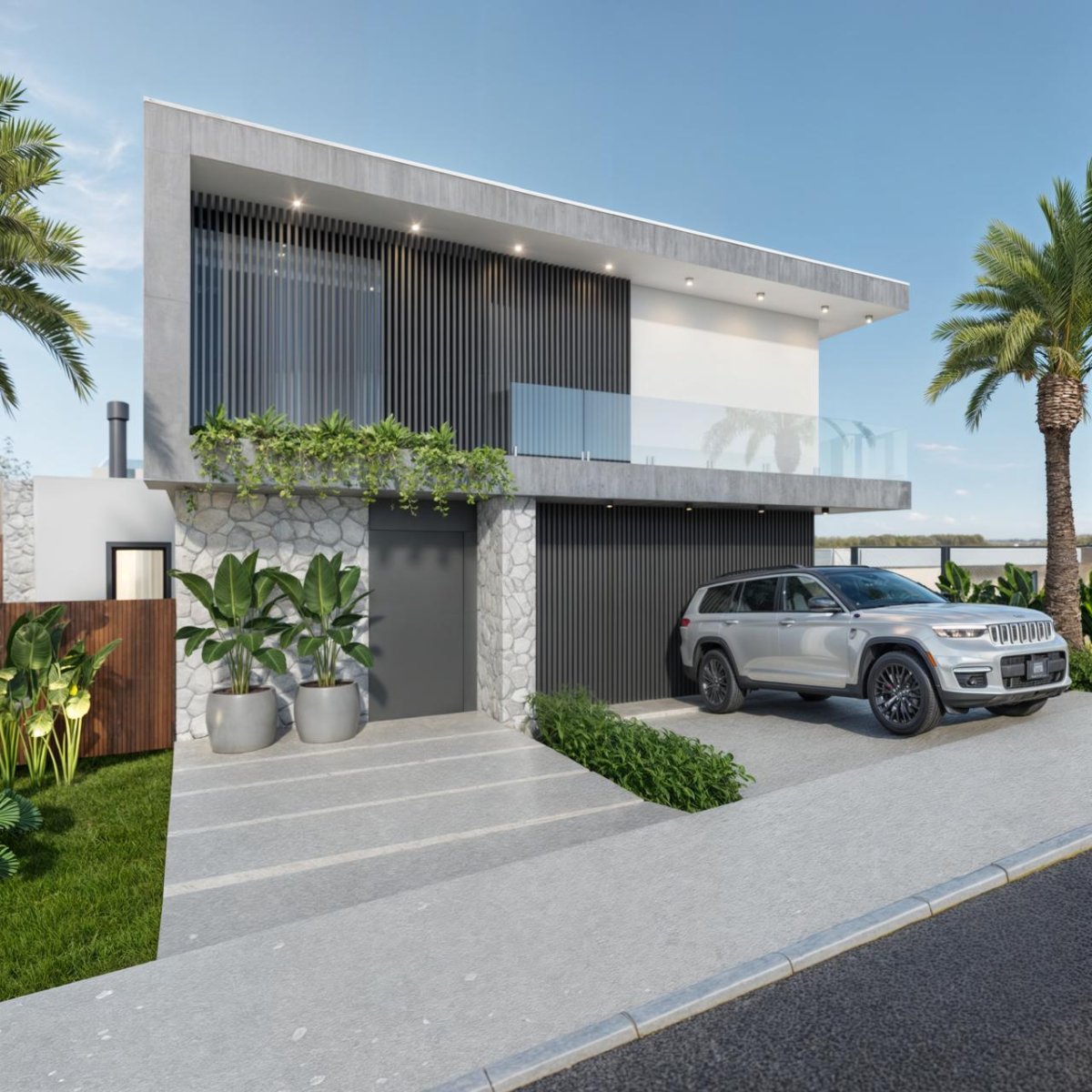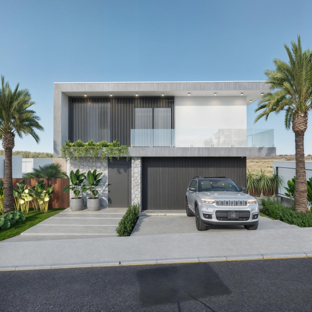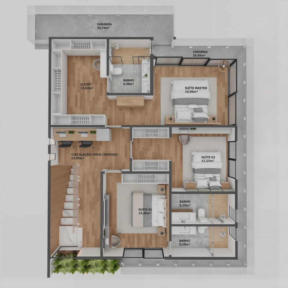 Pavimento Superior: 01 suíte master com varanda, 01 suíte com closet e varanda, 01 suíte com varanda, circulação e escritório.
